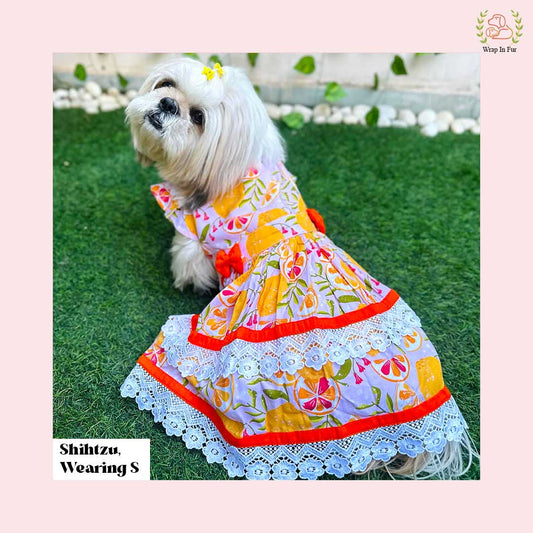 Tropical Citrus Print Dog Princess Dress - Lace Trim Summer Frock