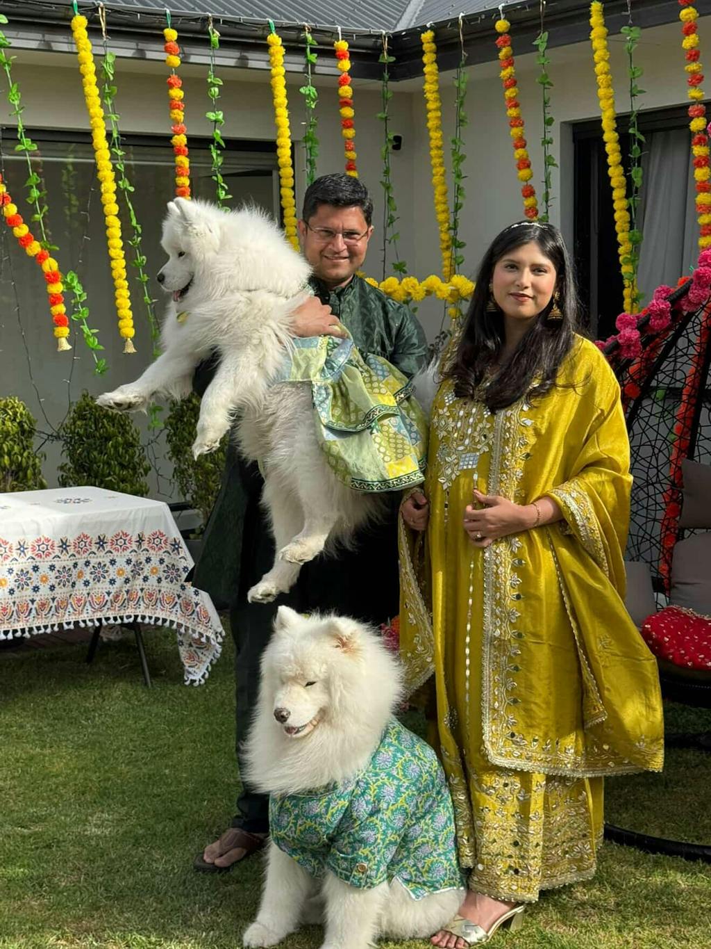 - Dog Celebration Outfit: Perfect for garden parties, sangeets, and formal dog party wear.