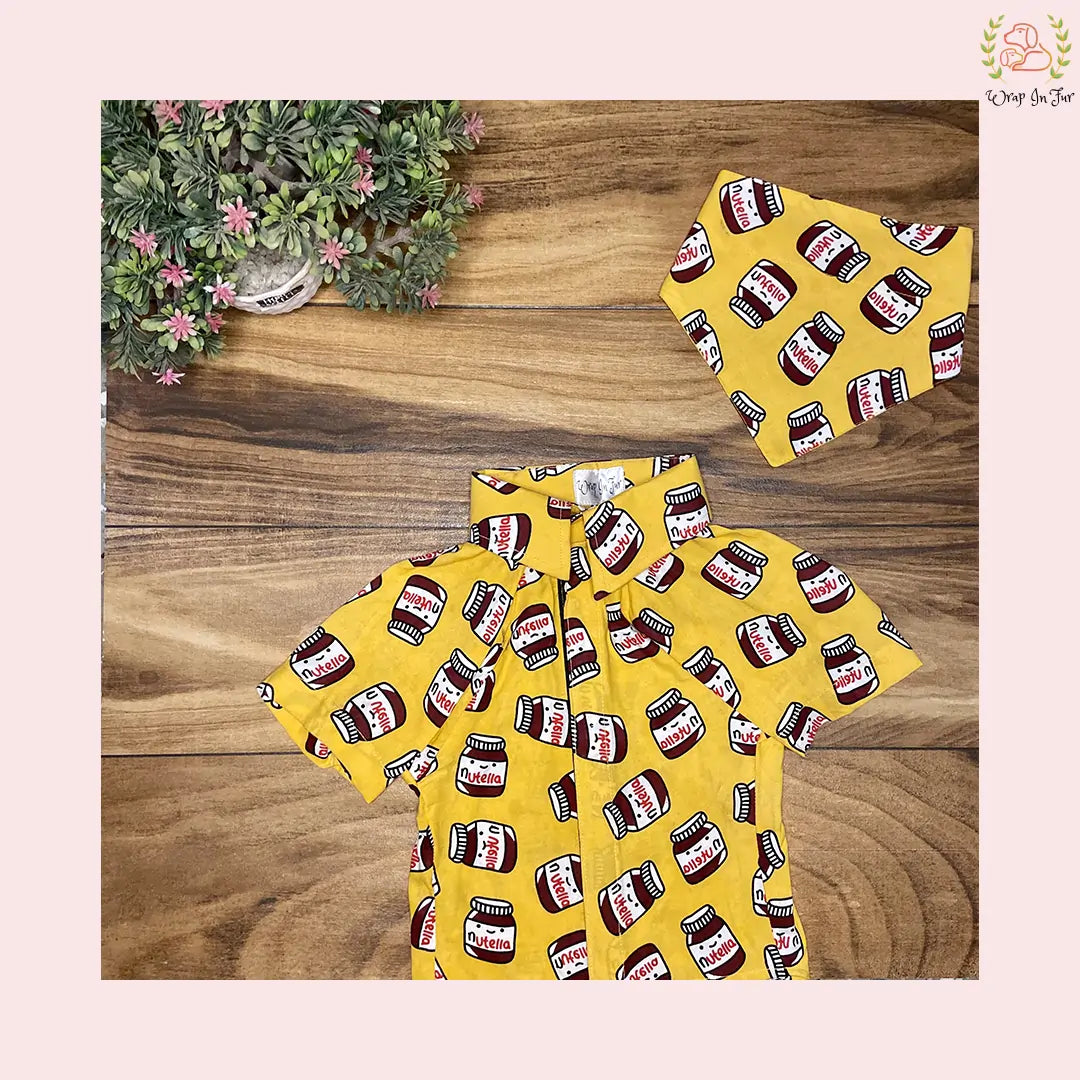 - This shirt depicted a bright mustard yellow background with a repeating pattern of Nutella jars. The playful design highlights the iconic hazelnut spread, making the shirt appealing for both food enthusiasts and those who enjoy fun, quirky fashion.