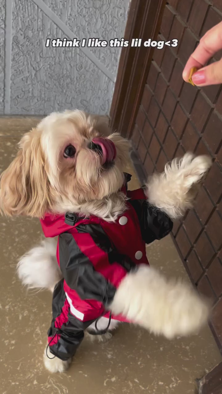 This Red black raincoat comes with hood attached to it. Wrapinfur Dog raincoat with legs is the best dog raincoat, it is classyand comfortable.