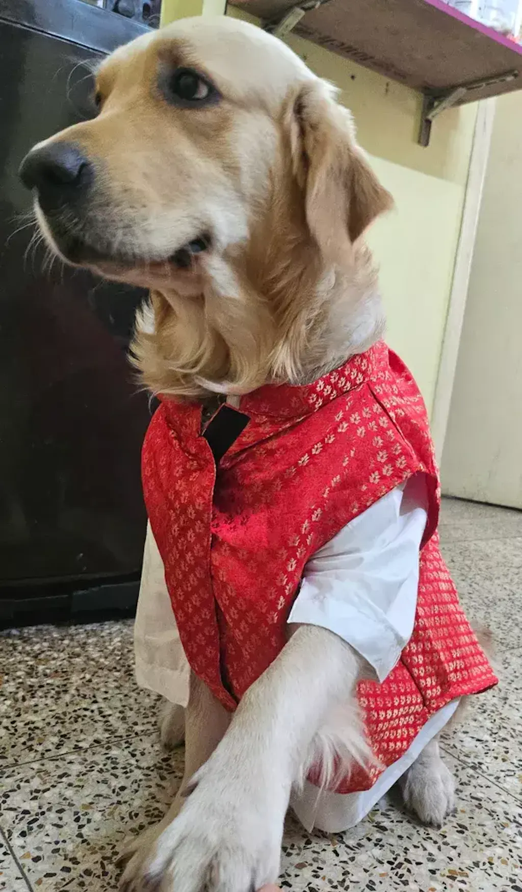 - Air Dry in Shade: Keep the dog kurta clothing away from direct sunlight to prevent the red and gold from fading.