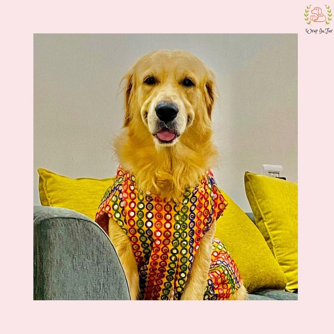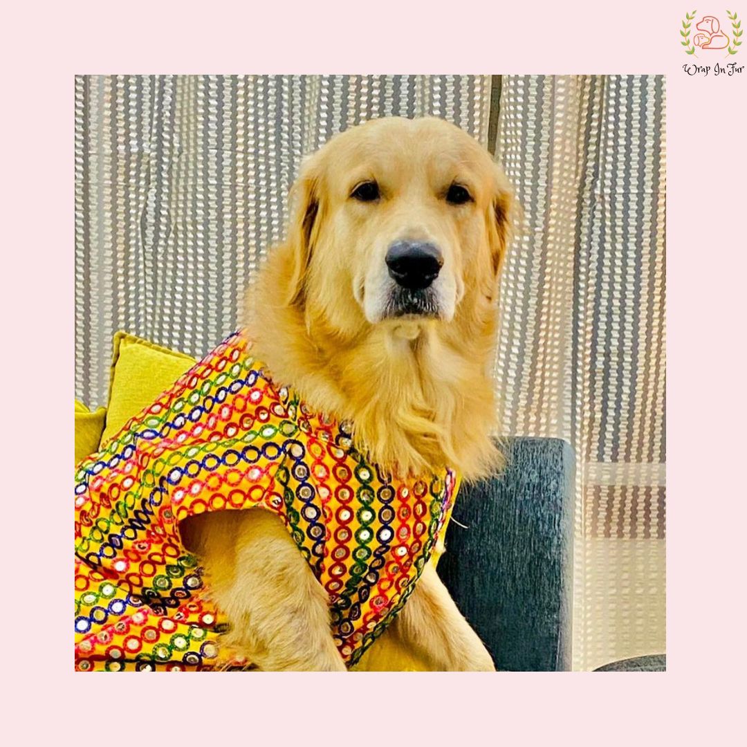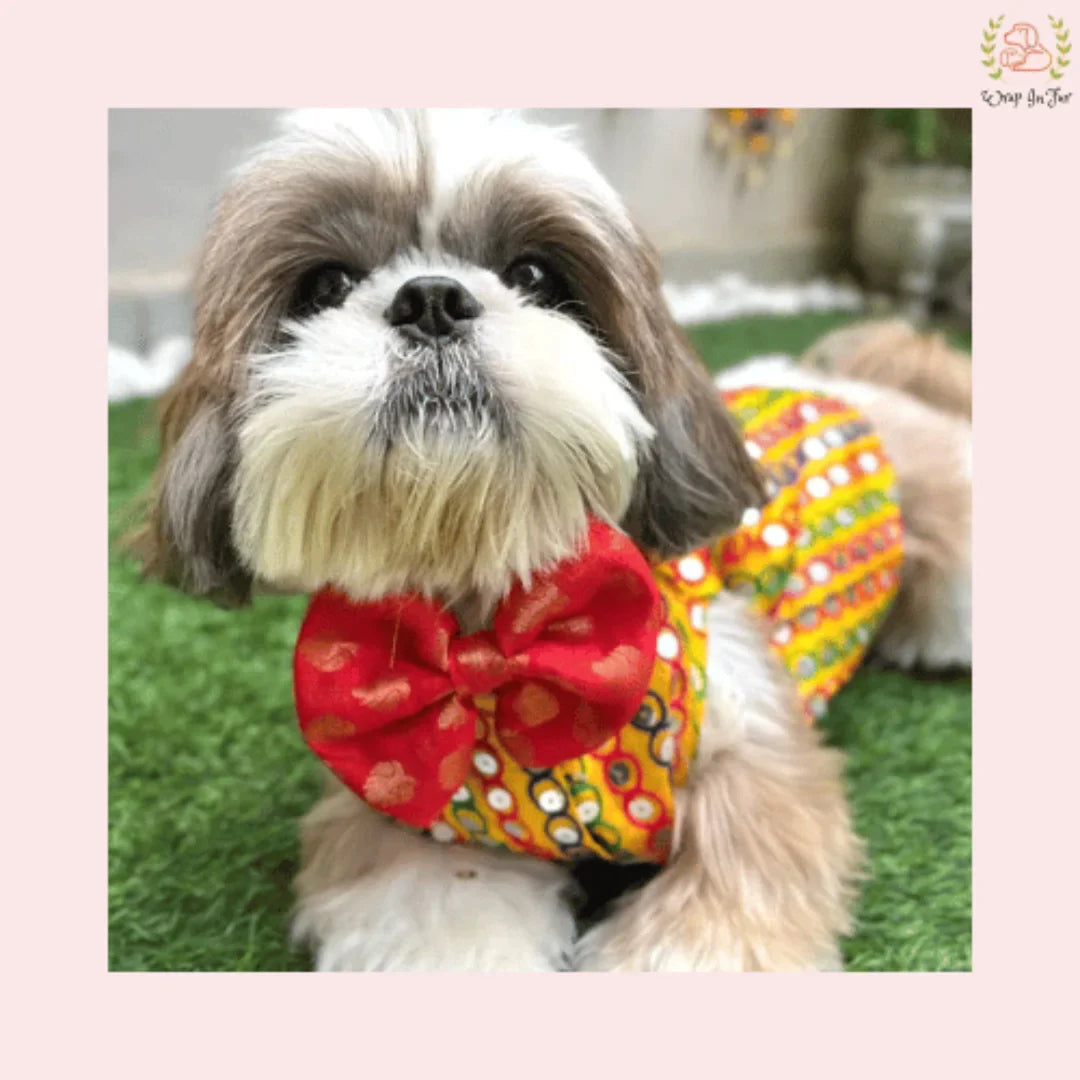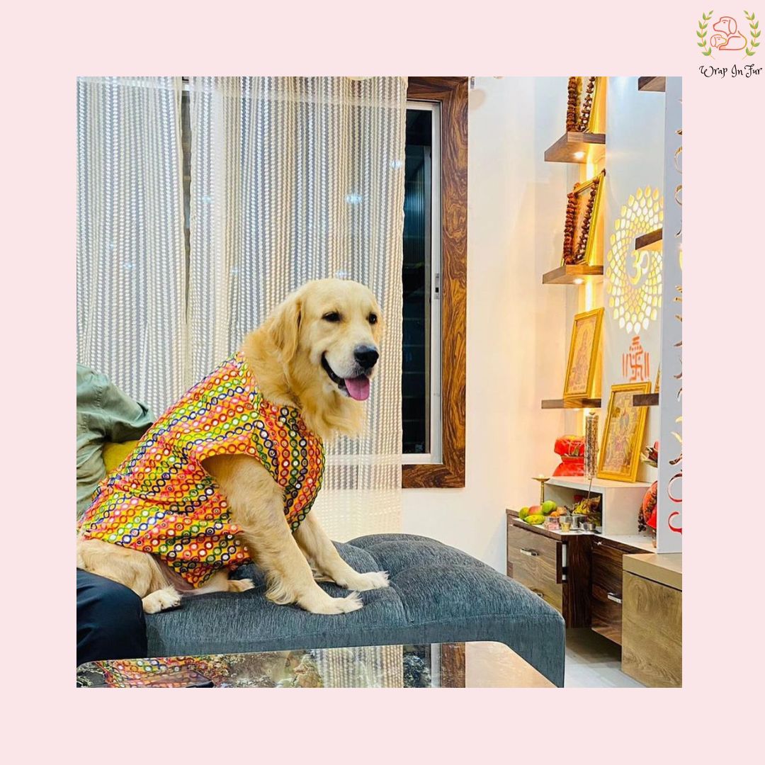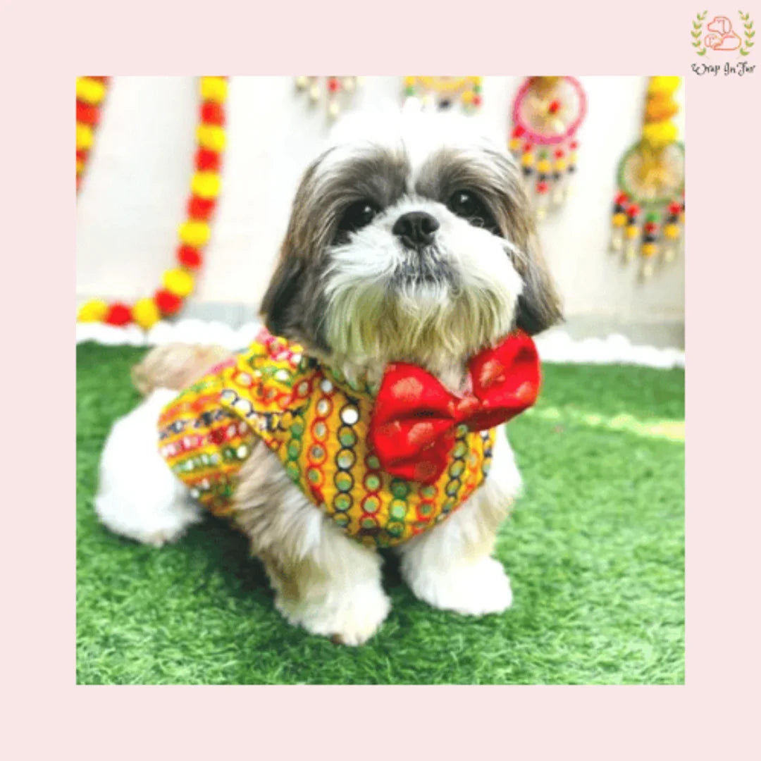 - A vibrant and colorful dog jacket ideal for festive occasions. The fabric is bright yellow, overlaid with multiple vertical stripes filled with multicolored circular patterns resembling a playful design. These circles are outlined in various shades like blue, green, red, and orange, contributing to a lively and eye-catching appearance. A large, shiny red bow is attached at the neckline.